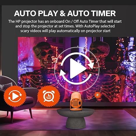 HallowBeam™ comes pre-loaded with 8 scary hologram movies (ghosts, skeletons, witches, and more). They loop automatically for nonstop scares.